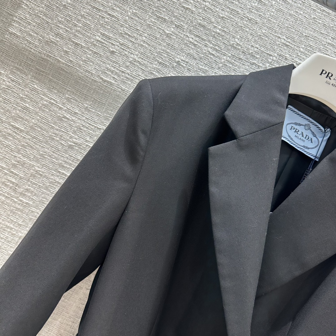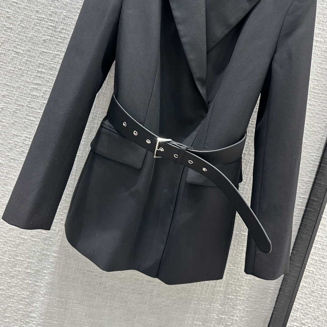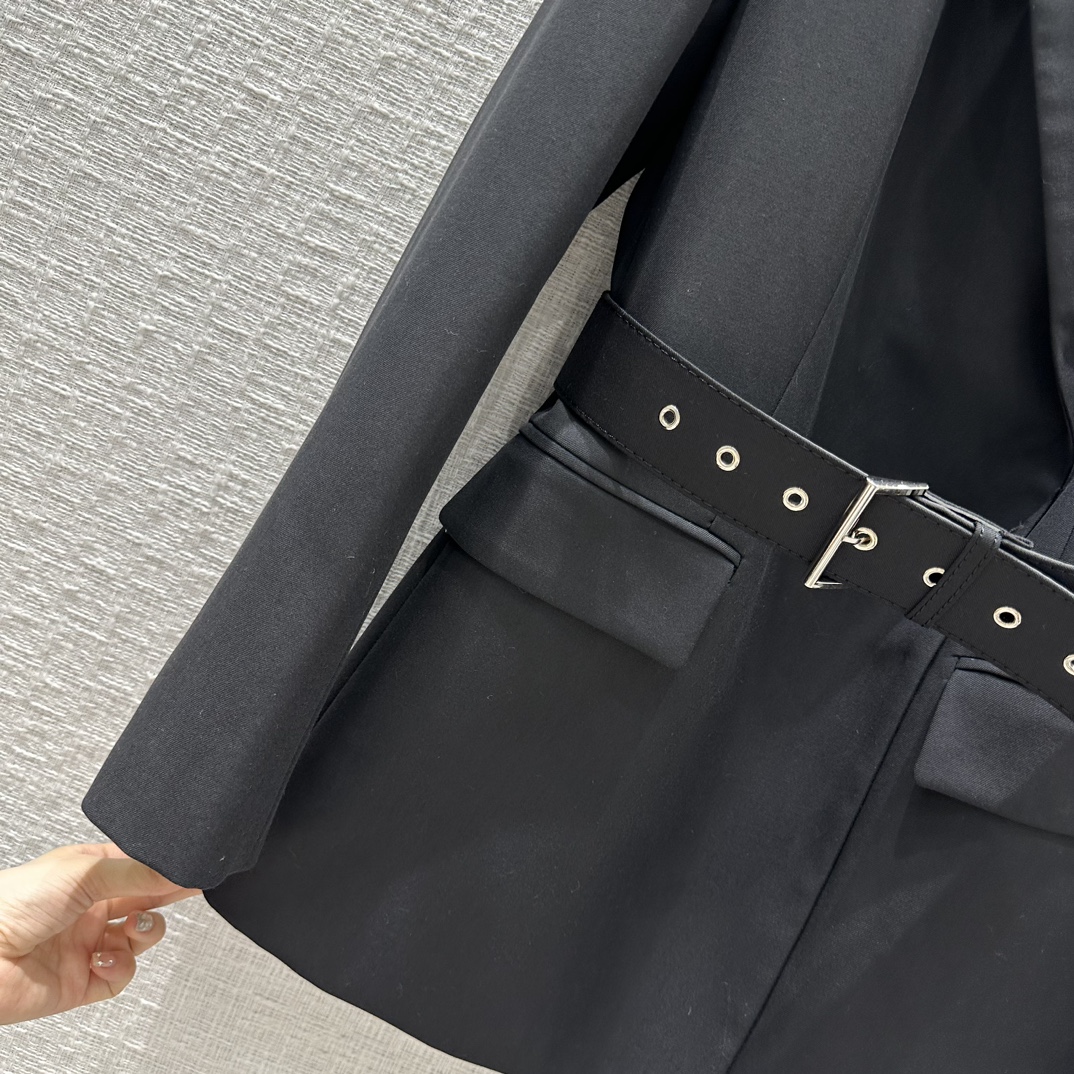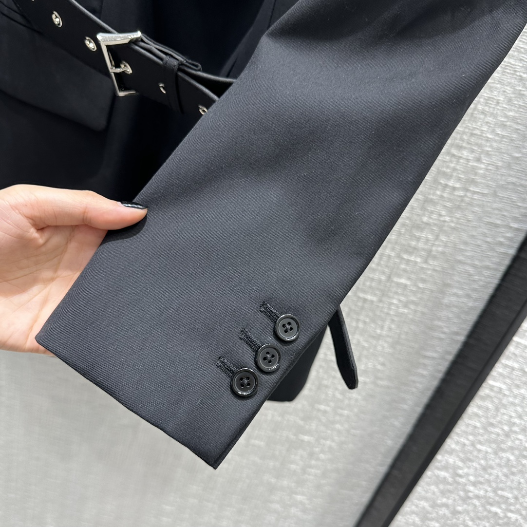 Prad*23 early autumn new product! Belted side button blazer! It can be sweet and salty, and the temperament is A and sassy! Triangular logo brooch embellishment is full of fashion sense! Imported fabric texture is superb! The corn belt has a waist-tight version with a capable temperament! The upper body looks thin and tall! The quality of perfect workmanship depends on the details, and the one-color SML spot is available for grabs. S size, shoulder width 41, bust 94, length 69, each size has a bust difference of 4, shoulder width and length difference of 1.
