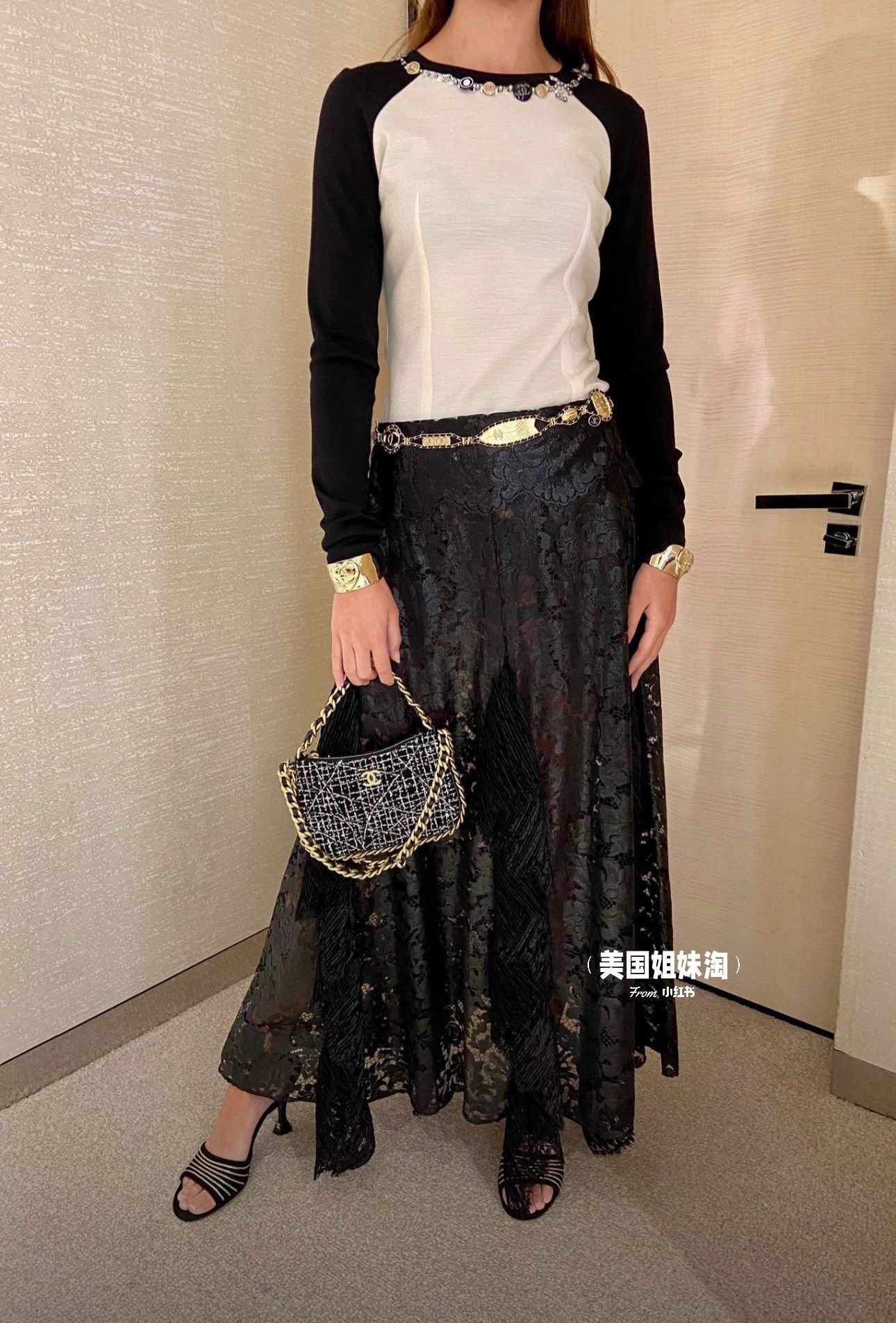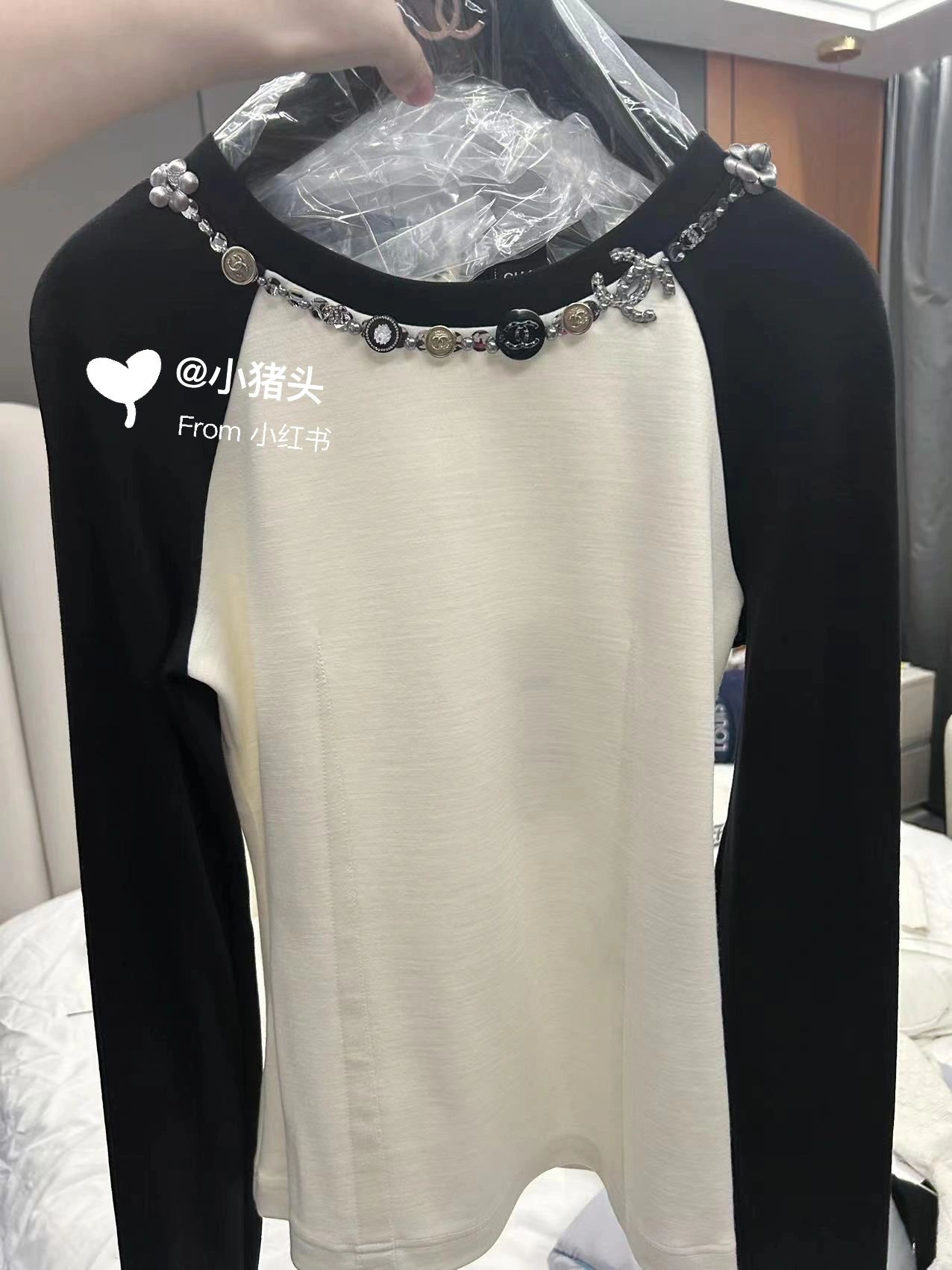 💰 🆕Chane*23A early autumn new Xiaoxiang collar decorative design long-sleeved T-shirt is as high-end and elegant as ever. The black and two-color collision are not picky! The collar letter logo and hardware image design easily highlight Xiaoxiang’s high-end The details are three-dimensional and full, and it looks like a high-grade, high-code version of SML.