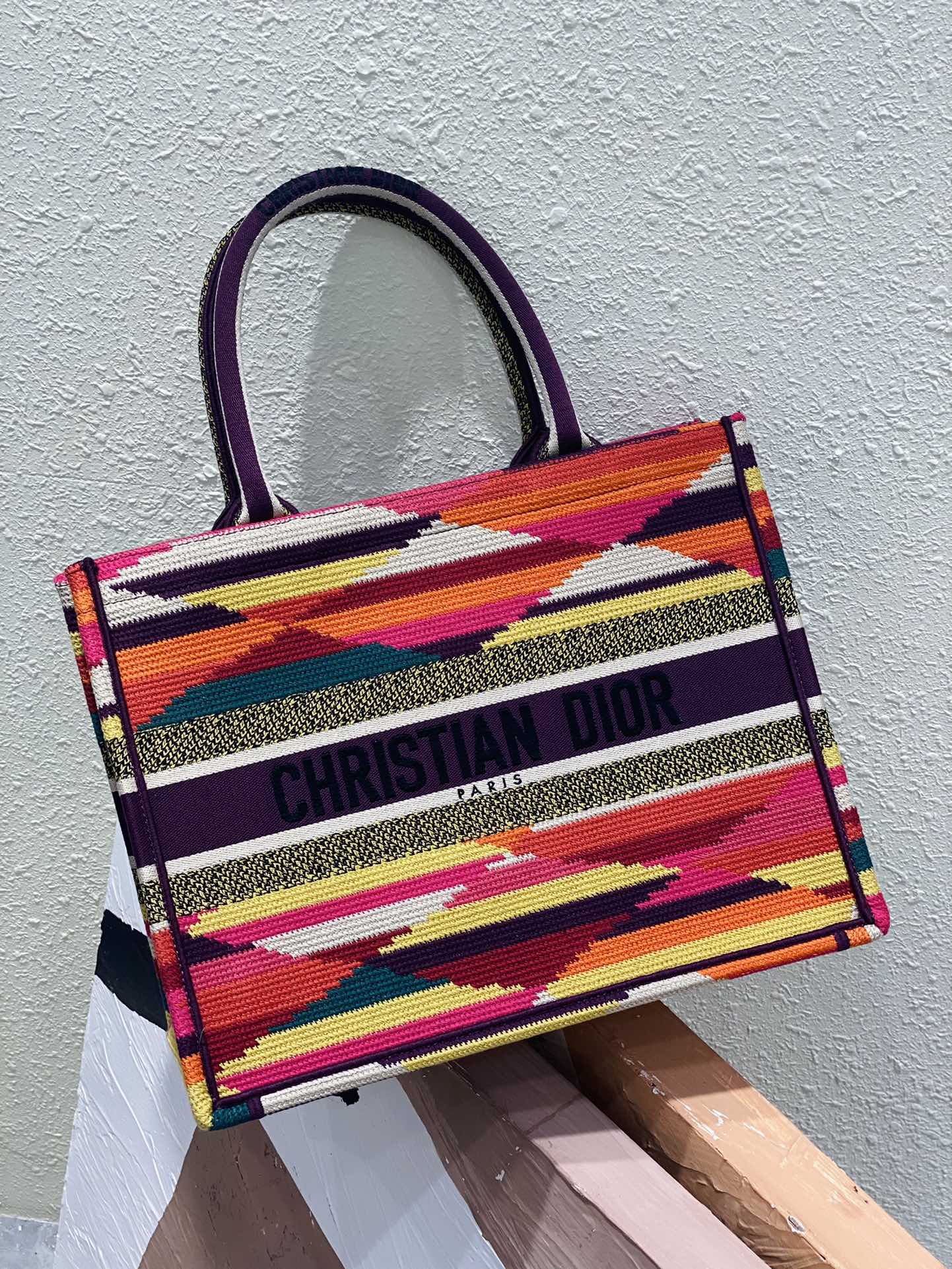 This Book Tote handbag is inspired by women’s creative director Maria Grazia Chiuri ) is the flagship product that embodies Dior’s aesthetic. It can store a variety of daily necessities. It is decorated with soft multi-color stripe embroidery throughout and the “Christian Dior” logo on the front, reflecting Dior’s exquisite craftsmanship.