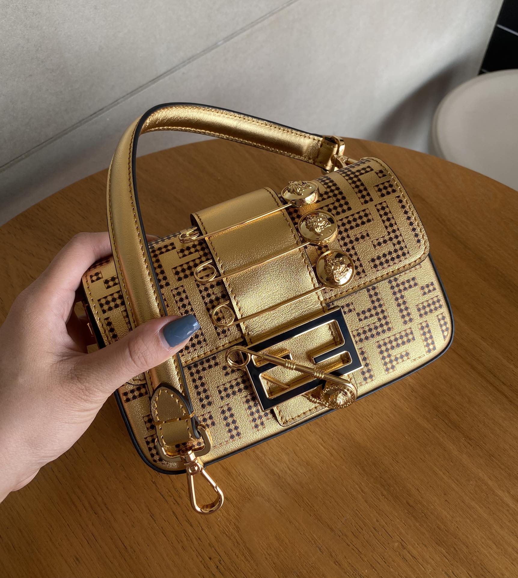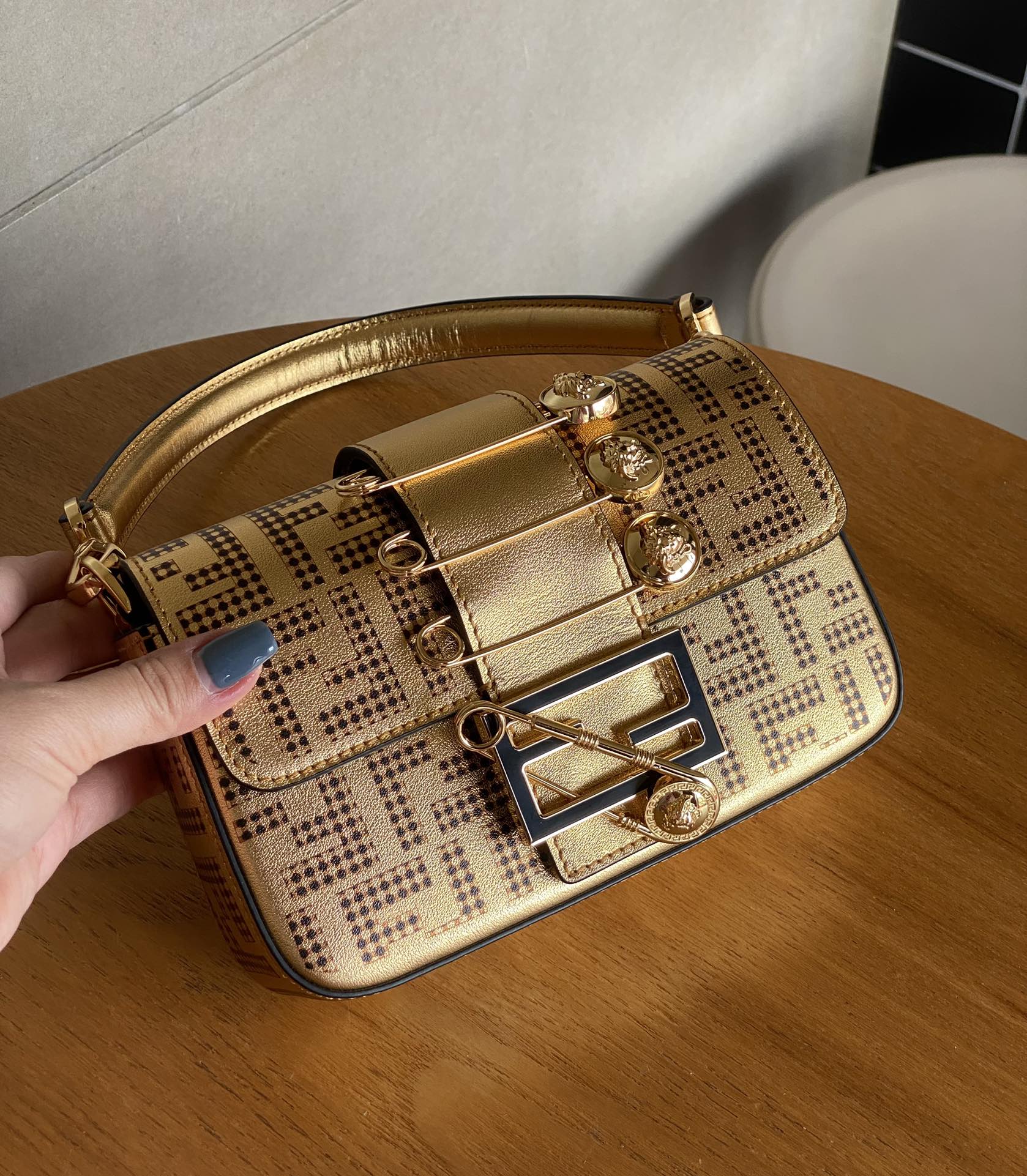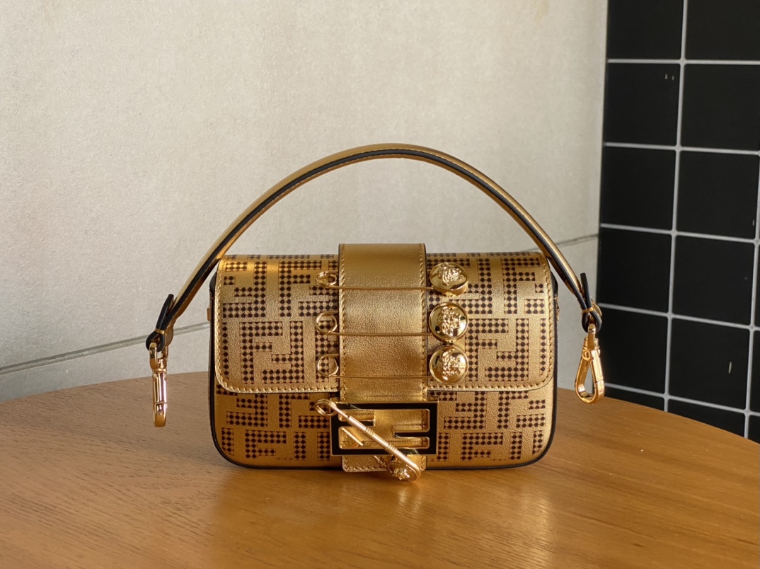 The iconic square Baguette mini handbag from the V ersace by F end1 series is coming😈 Made of black smooth leather, with three Medusa metal pins on the front flap decorate. FF closure with black plexiglass and safety pin. Magnetic closure, burgundy satin-lined interior compartment with internal pocket and gold-finish hardware. Equipped with long handles, it can be carried under the armpits.