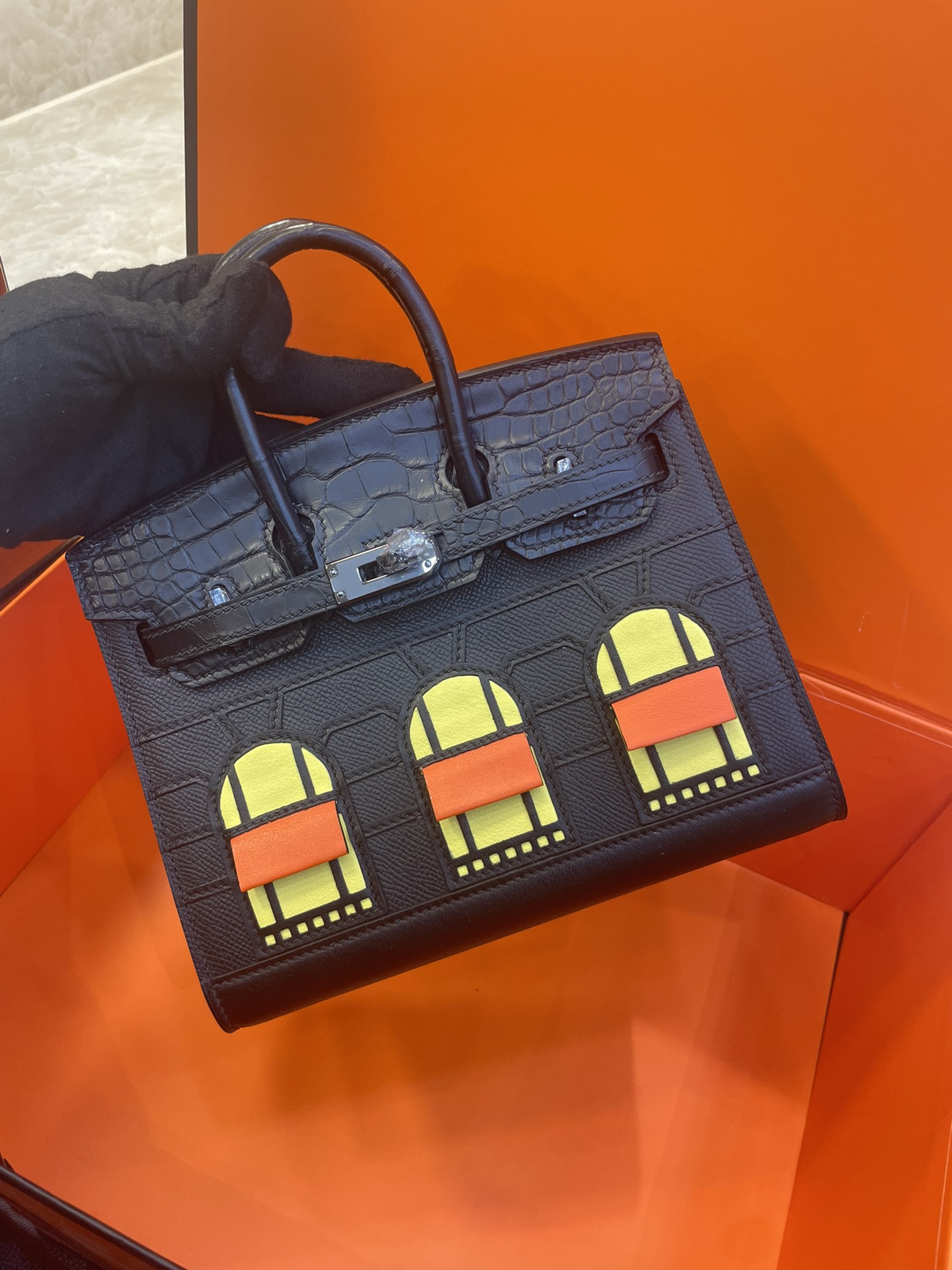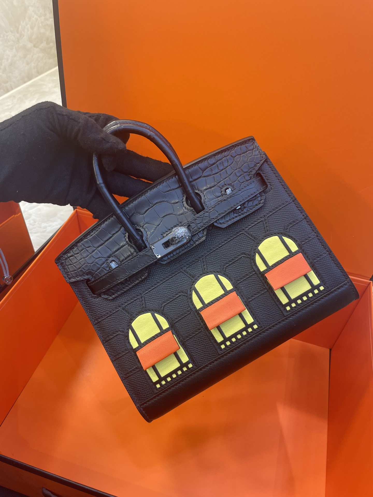 Birkin house 20 black epsom spelled with American alligator, gun buckle, fully handmade wax thread, outer seam