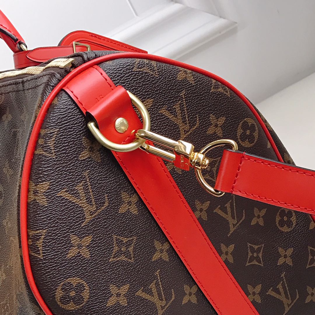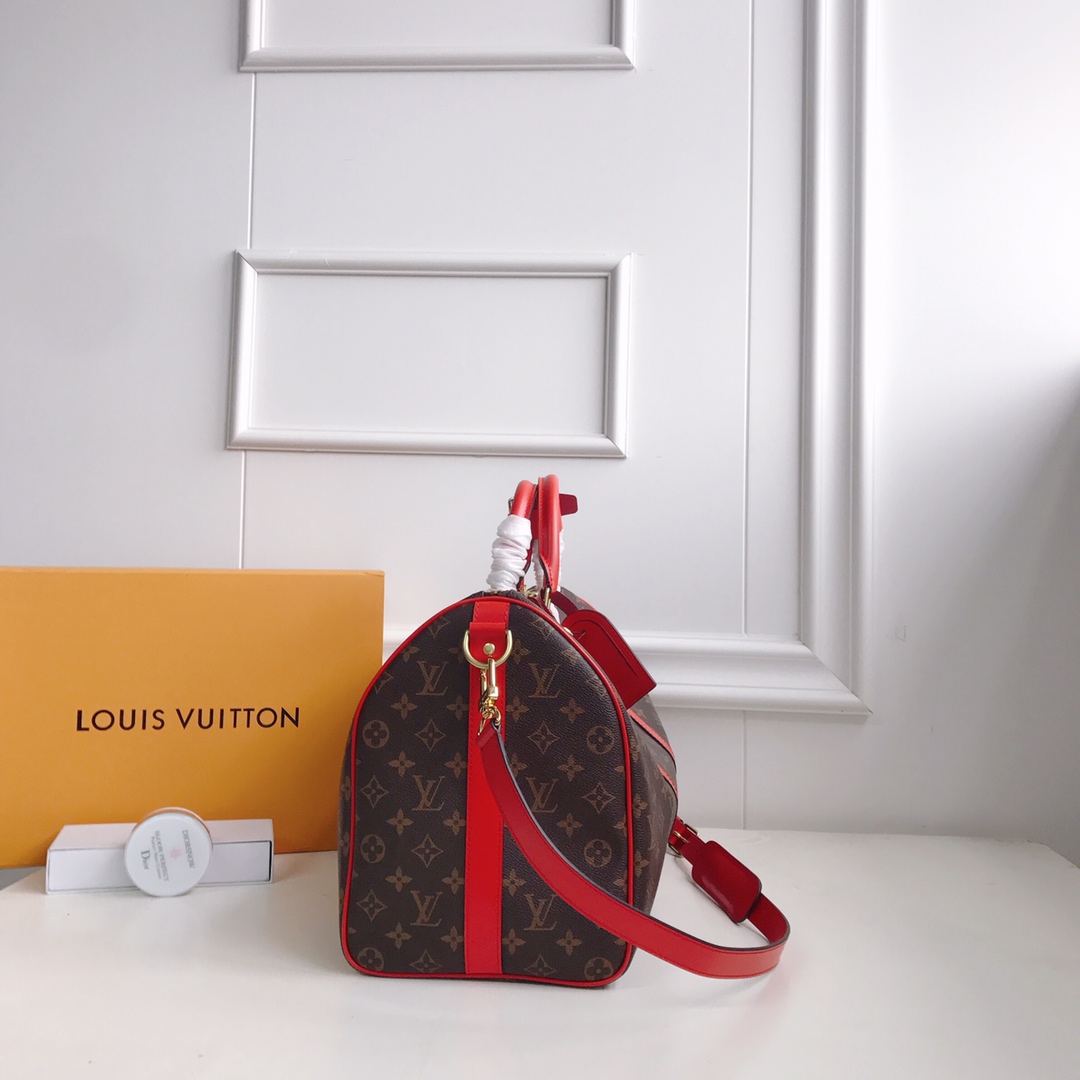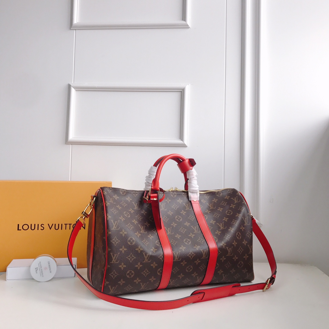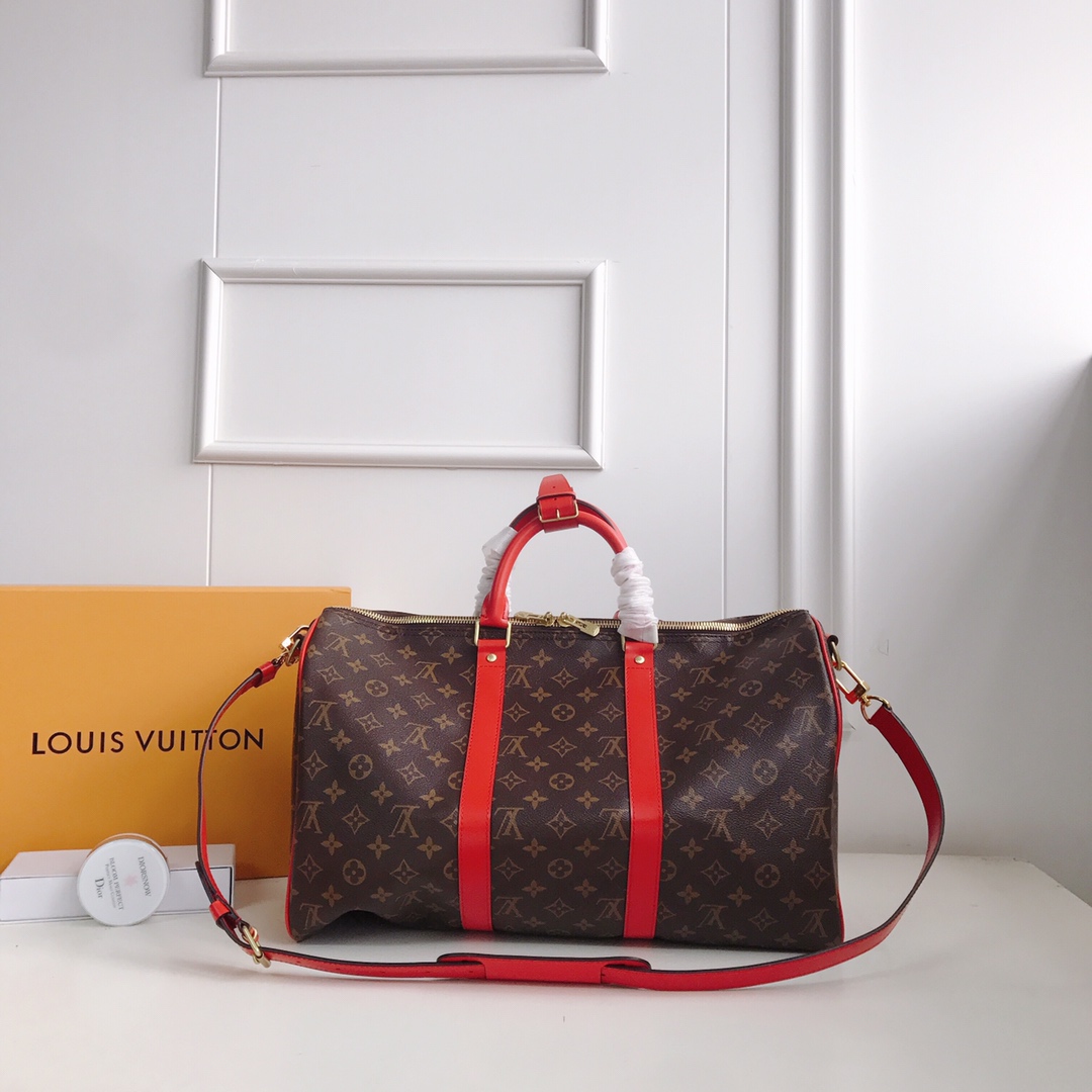 Top original KEEPALL 50/55 travel bag (with shoulder strap) 41413 41416 41418 The Keepall series, launched in 1924, is the modern ancestor of handbags. Soft and roomy, it’s crafted from Monogram canvas with a double-zip closure and a removable name tag. Dimensions 45 x 27 x 20 cm/50 x 29 x 22 cm
